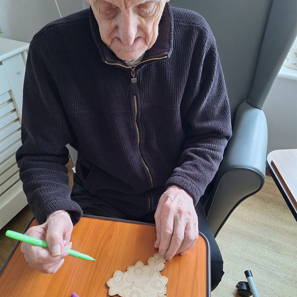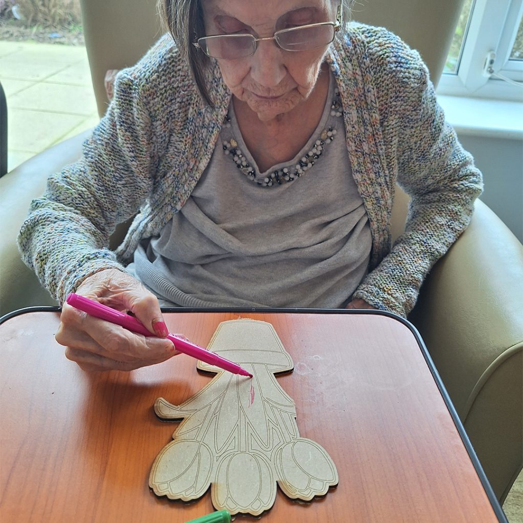 The visit brought together residents and young children to decorate wooden spring flower shapes, creating a calm and sociable activity that encouraged conversation, creativity and shared enjoyment.